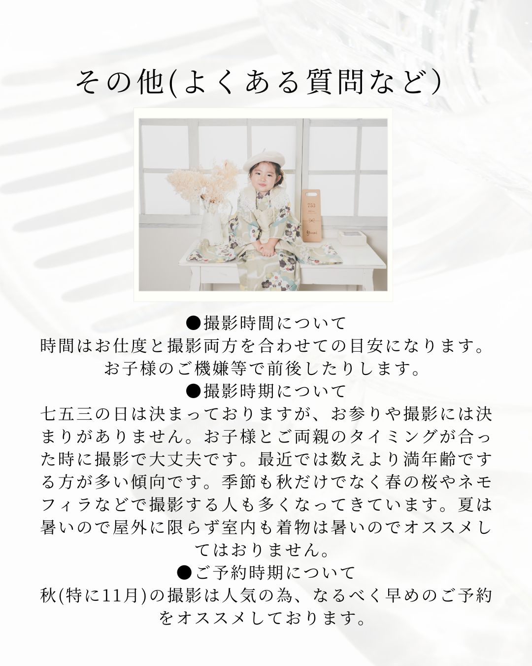 当スタジオでは着物1着に対して様々な小物やヘアアクセサリーチェンジをしながら撮影するのでお子様のご機嫌にもよりますが3~5回はガラッと雰囲気が変わります。違う背景だけど着物コーディネートが同じという事に物足りなさを感じているお客様にはきっと満足して頂けると思います。